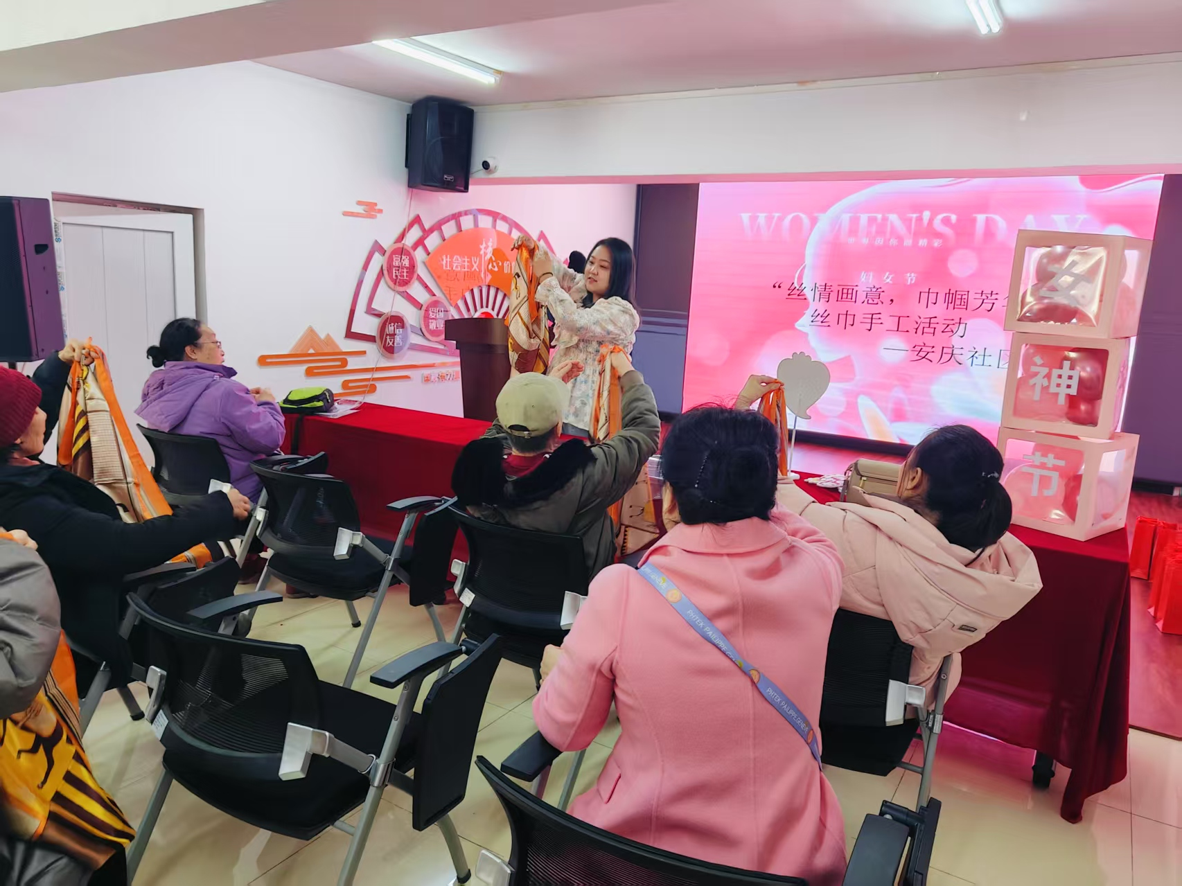 为庆祝“三八”国际劳动妇女节,丰富辖区女性精神文化生活,3月5日上午,安庆社区教育学校联合中国人寿开展“丝情画意 巾帼芳华”丝巾手工活动。